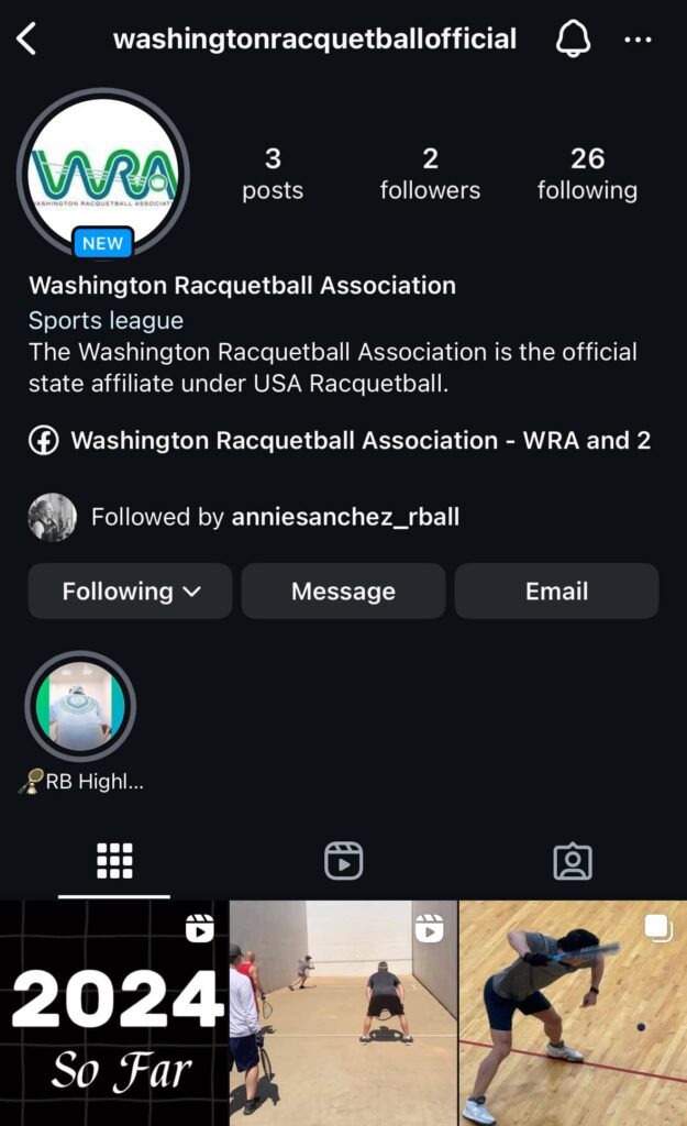 August 8, 2024February 10, 2025 Micah Miller New WRA Instagram page Did you know we now have an Instagram page? If you have an Instagram account please give us a follow and interact with the page. https://www.instagram.com/washingtonracquetballofficial